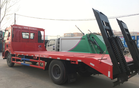 解放J6L挖掘机拖车产品介绍:正宗国五 底盘配置:解放J6新款排半驾驶楼,轴距5米,大柴180马力发动机,陕西法士特8档变速箱,4.5吨前桥,9吨后桥,900R20钢丝轮胎,232mm双层大梁,带原厂ABS、空调、行车记录仪、气囊座椅。 上装配置:底板采用5mm或8mm花纹板,平板底板横梁采用100*100*5mm方管制作,横梁间距25公分,斜支撑加密,爬梯采用双弹簧加强型设计,三条筋+双弹簧加固焊接,可选液压爬梯或折叠加长型液压爬梯,斜坡处带后支腿,平板有效板长6.6米(含斜坡),板宽2.5米,平板两侧可以加装活动可拆卸栏板,该车为15吨及以下挖机首选车型。